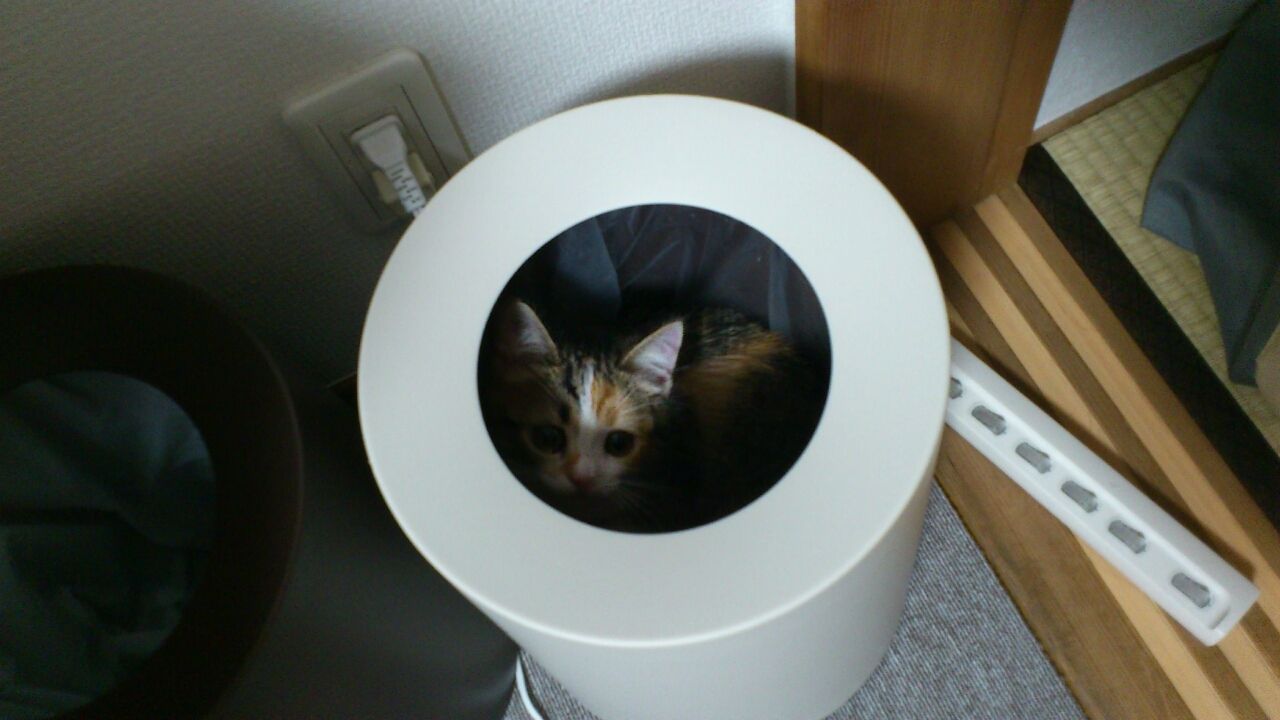 2013/08/21 猫はゴミ箱の中から見ている。 コメント数:0 コメント カテゴリ:猫は見ている【写真】 by こはなちゃん ゴミ箱に隠れている猫。 中からこちらの様子をうかがっている。 驚かそうとして出てきたが、逆に見つかって『みつかった!』の顔。