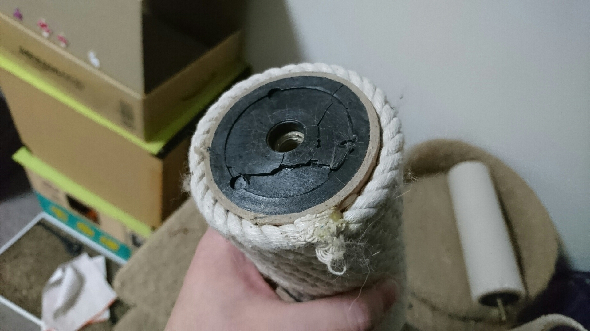 この状態で使い続けると、力がかかった際にパーツが割れ折れ、キャットタワー上部が倒れることになる。怪我にもつながりかねない、猫にも人にも非常に危険な状態である。