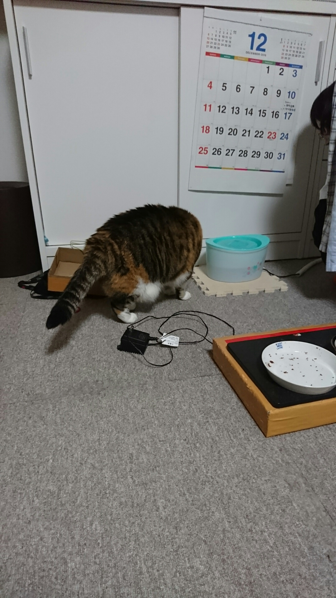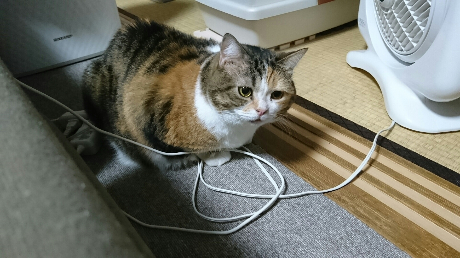 修理のようすを心配そうに見守るこはなちゃん。視線の先には分解されたキャットタワーが。
