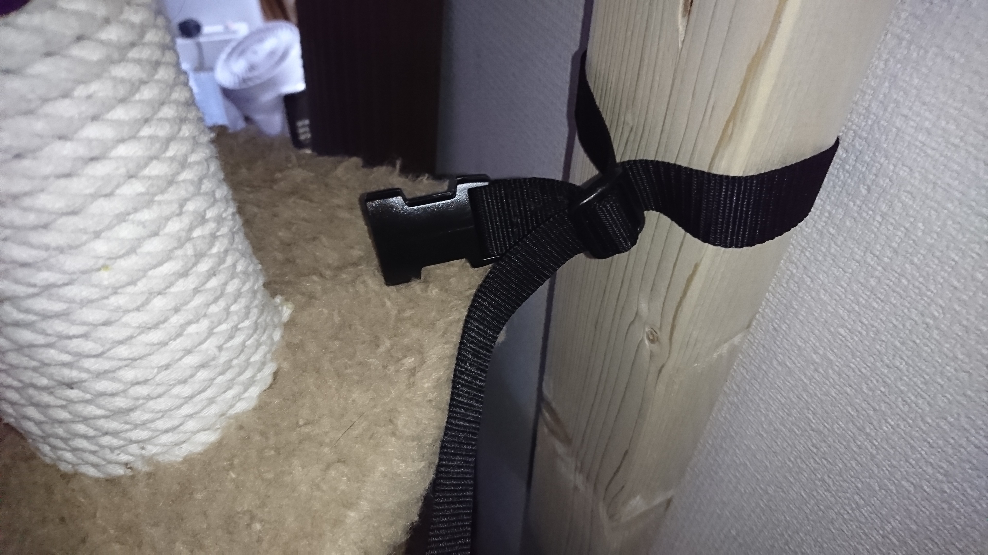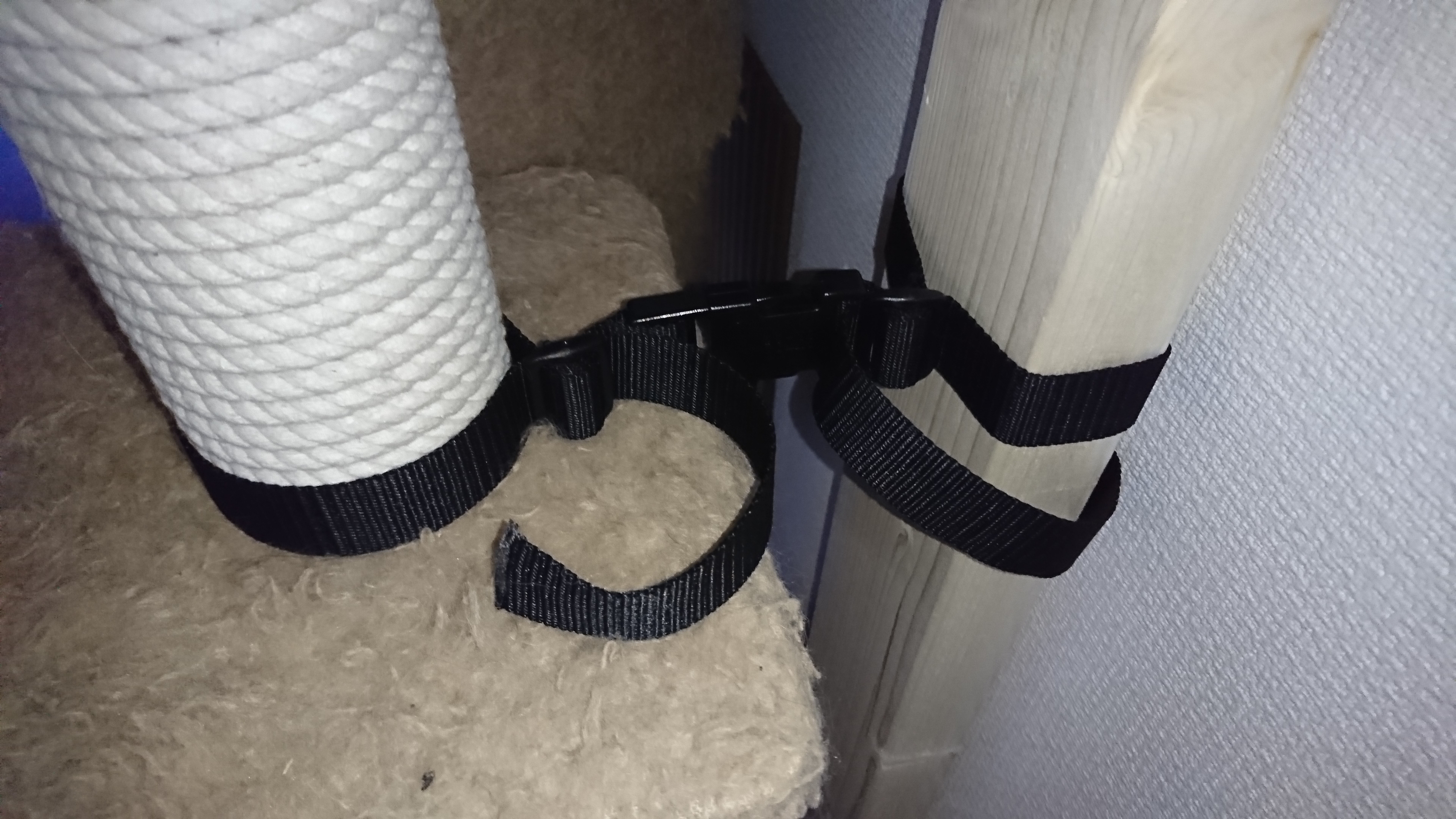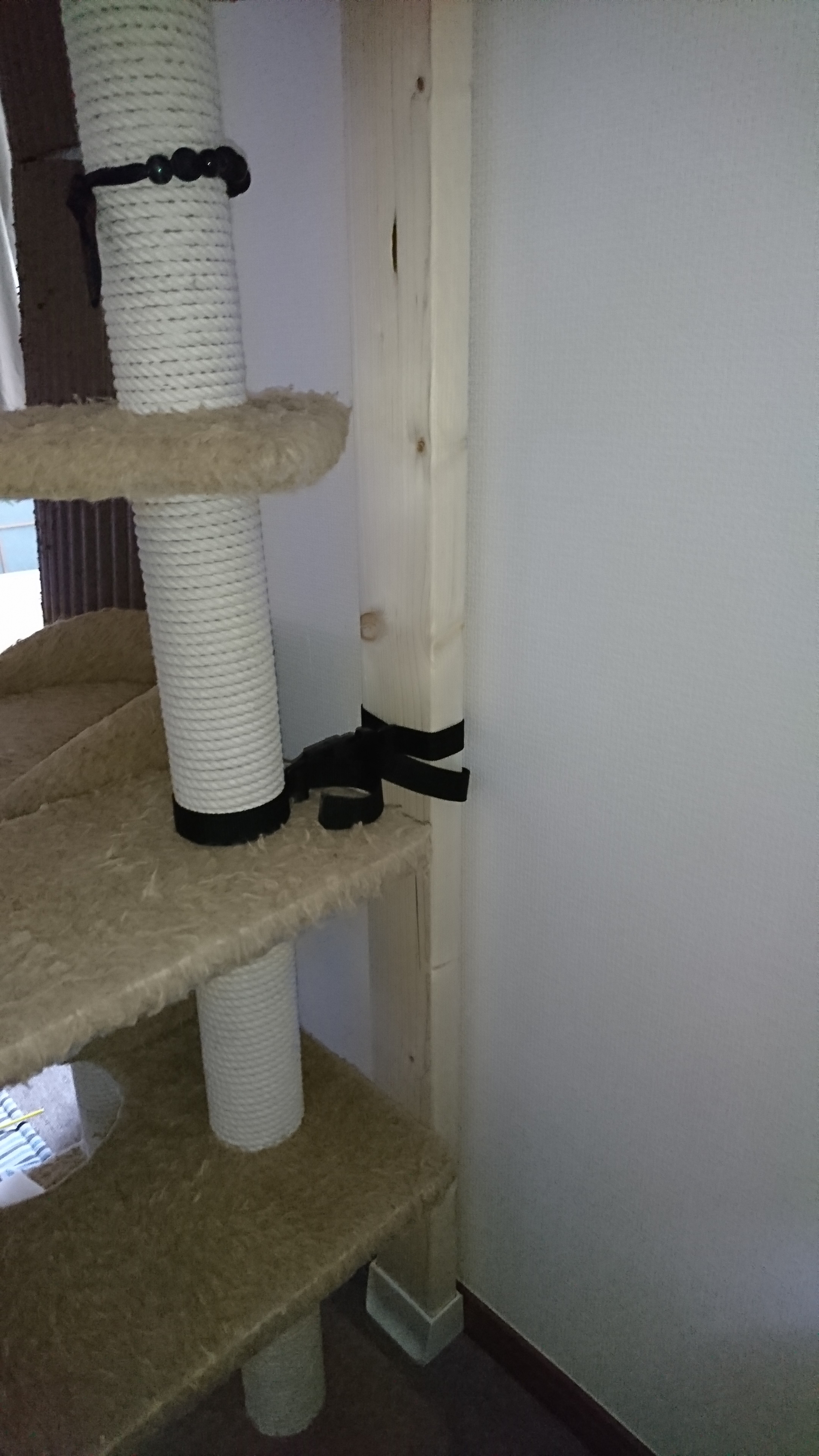 2019/08/16 キャットタワーの耐震補強。 コメント数:0 コメント カテゴリ:グッズ【写真】 by こはなちゃん 天井に突っ張らないタイプのキャットタワーの耐震補強。壁に穴を開けない編。■手順1、2x4材で壁に柱を立てるディアウォールx1…980円2x4材2440mmx1…598円水平が取りづらい。2、ベルトで結ぶユタカメイク結束ベルト2mx1…200円ニフコアジャスターx1…98円ニフコバックルx1…298円■完成後の様子 ■ベルト作成&取付の様子縫うのが大変。。