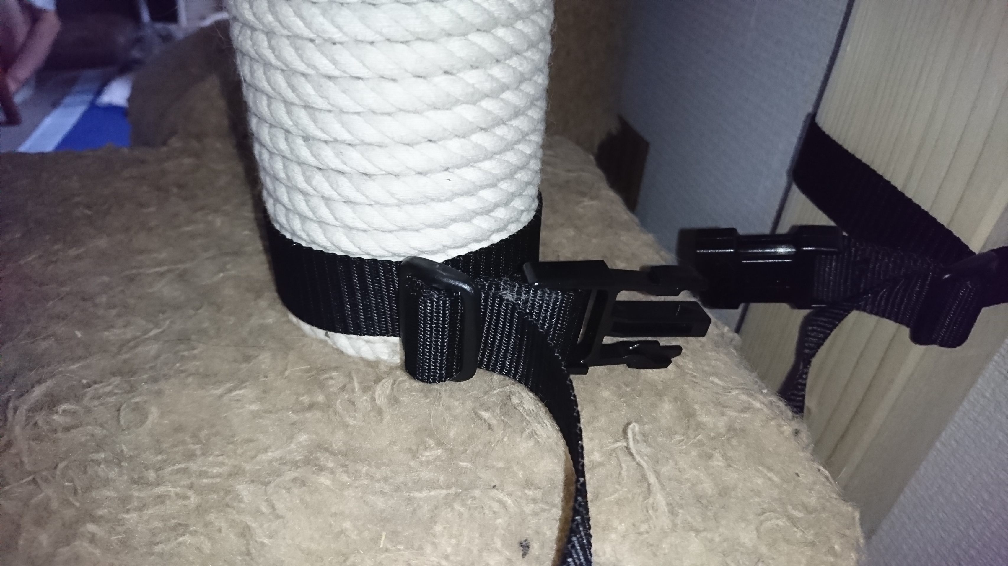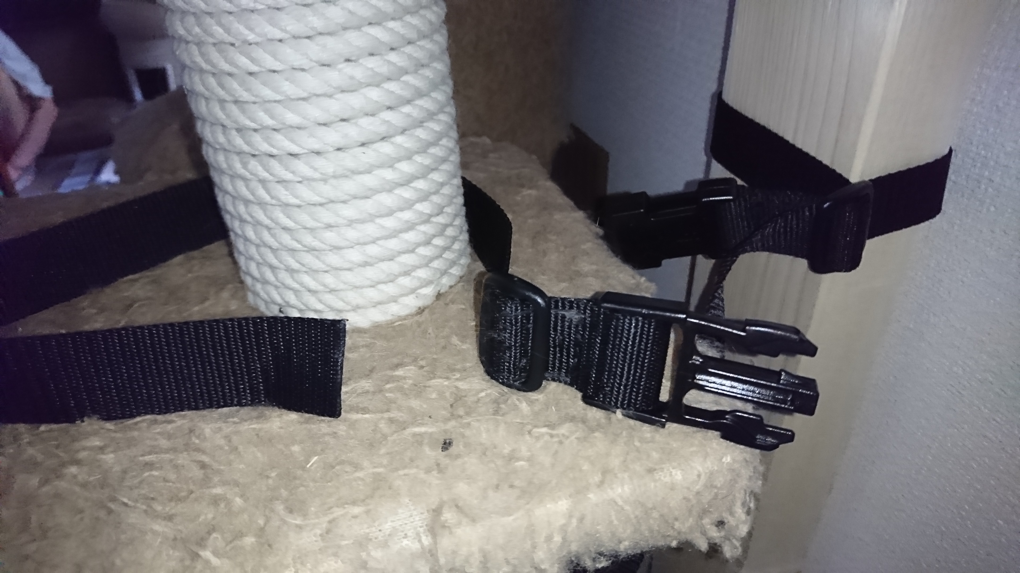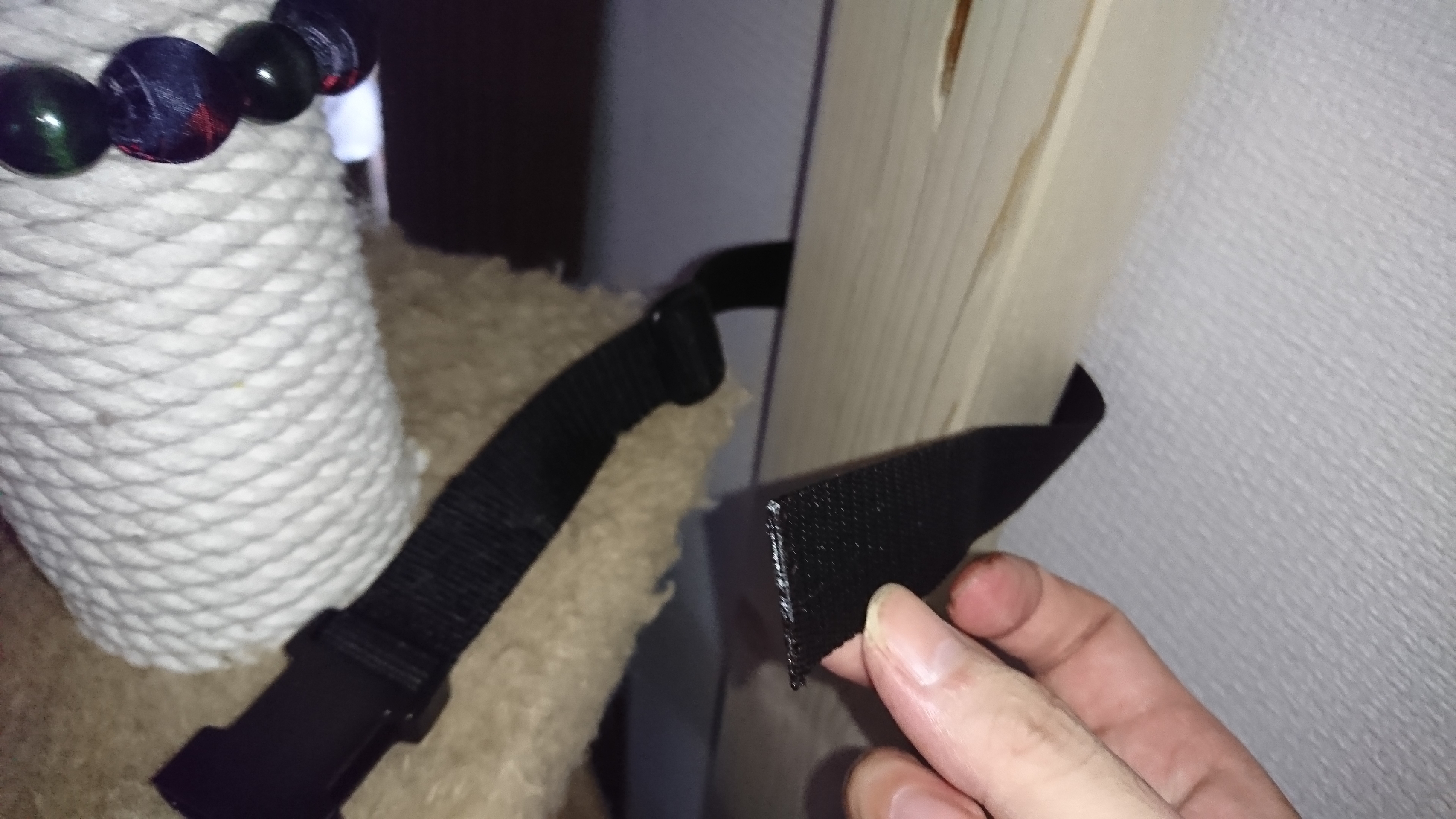 2019/08/16 キャットタワーの耐震補強。 コメント数:0 コメント カテゴリ:グッズ【写真】 by こはなちゃん 天井に突っ張らないタイプのキャットタワーの耐震補強。壁に穴を開けない編。■手順1、2x4材で壁に柱を立てるディアウォールx1…980円2x4材2440mmx1…598円水平が取りづらい。2、ベルトで結ぶユタカメイク結束ベルト2mx1…200円ニフコアジャスターx1…98円ニフコバックルx1…298円■完成後の様子 ■ベルト作成&取付の様子縫うのが大変。。